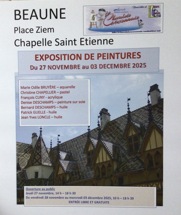 Exposition à BEAUNE , Chapelle Saint Etienne, place Zyem, de plusieurs peintres des Chevalets Auxonnais. (Acryliques, Aquarelles, Huiles, Pastels et Peintures sur soie).